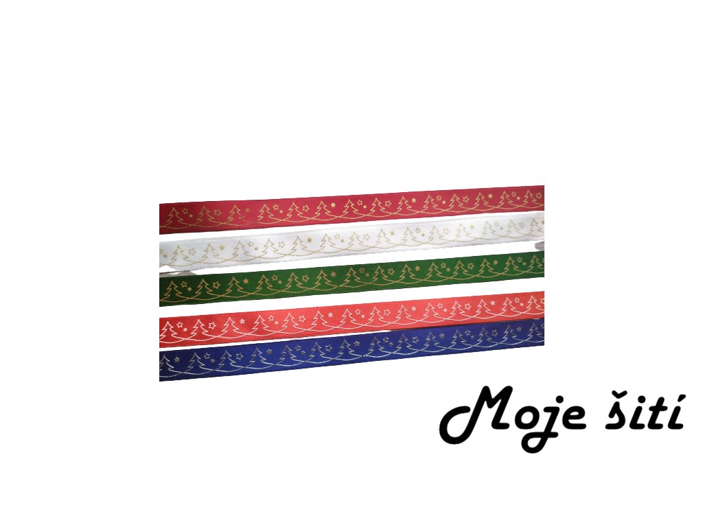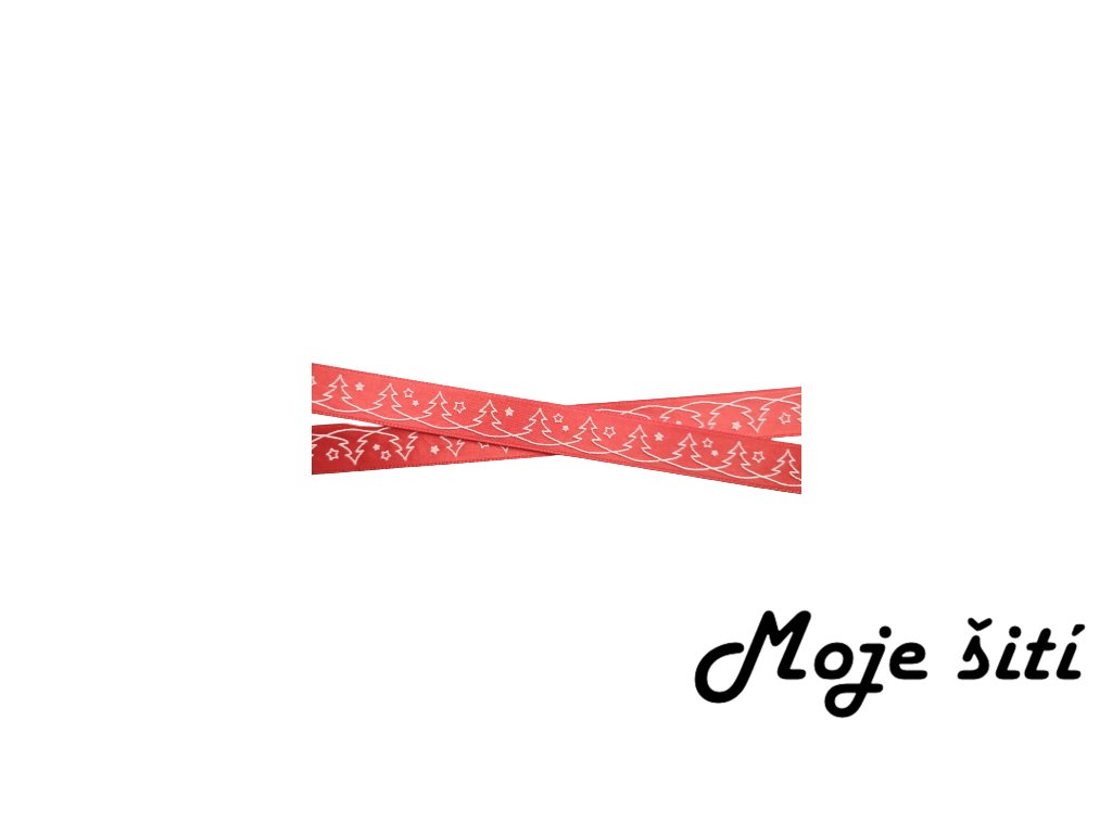 Atlasová ozdobná stuha 15mm - Bílé stromečky na červené