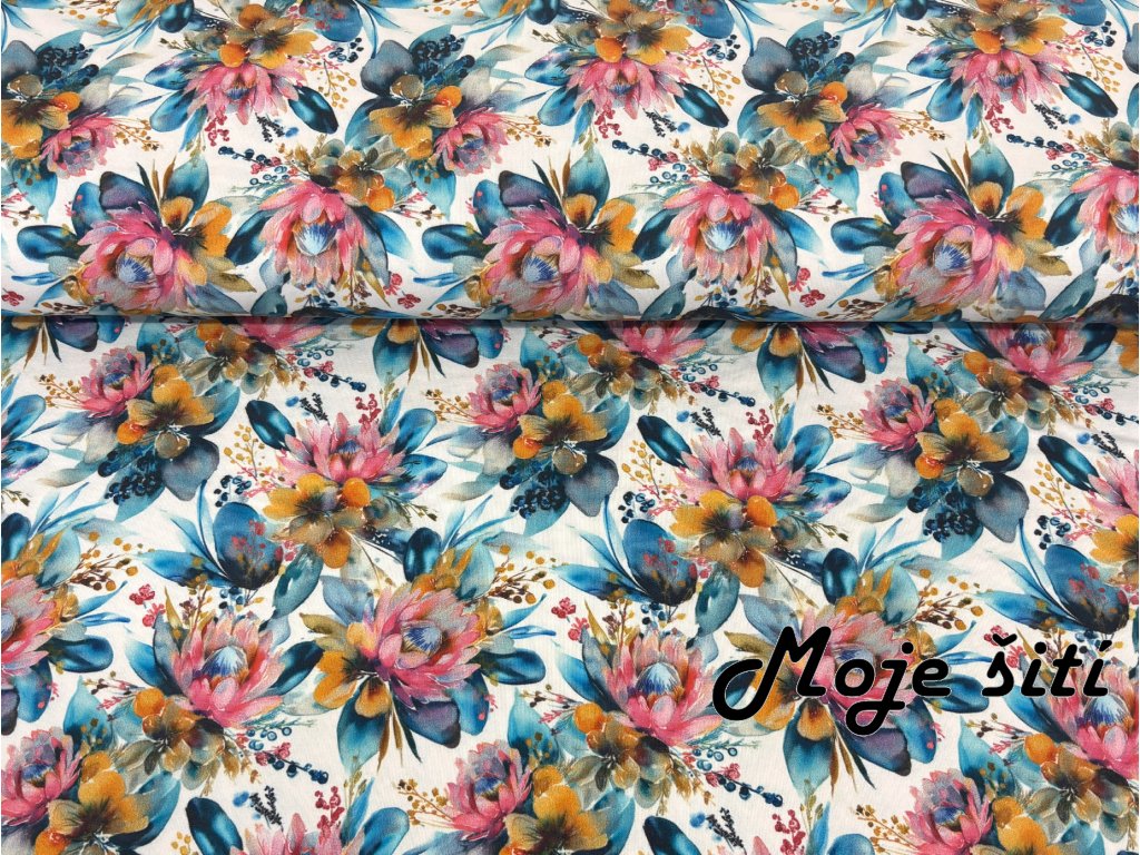 Bavlněná teplákovina - Barevná kytice na bílé