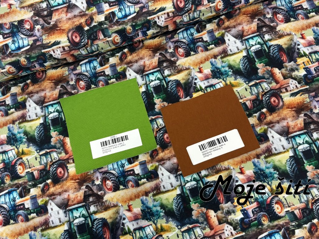 Bavlněný úplet s elastanem - Akvarelové traktory 190g