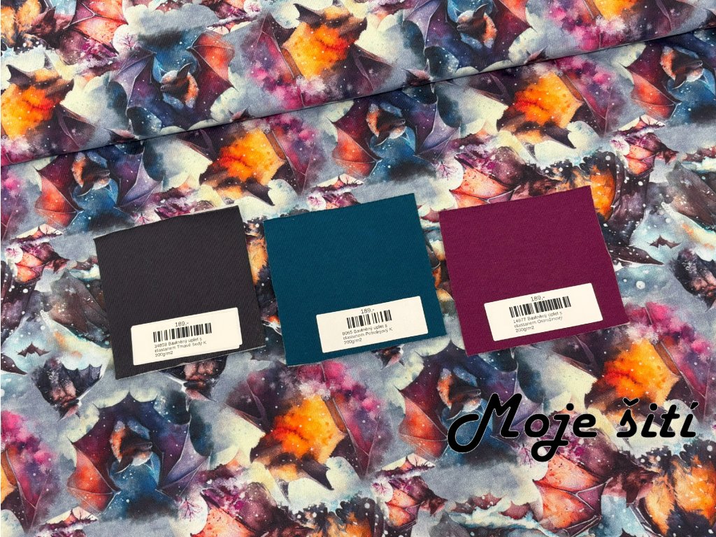 Bavlněný úplet s elastanem - Akvareloví netopýři 210g