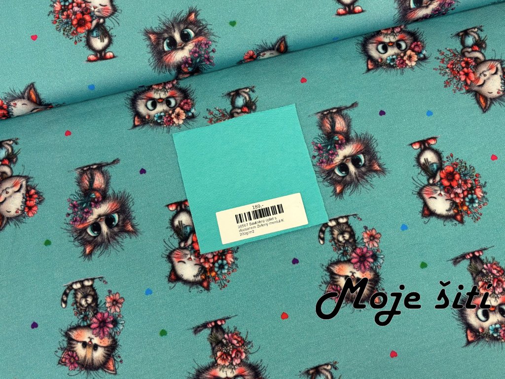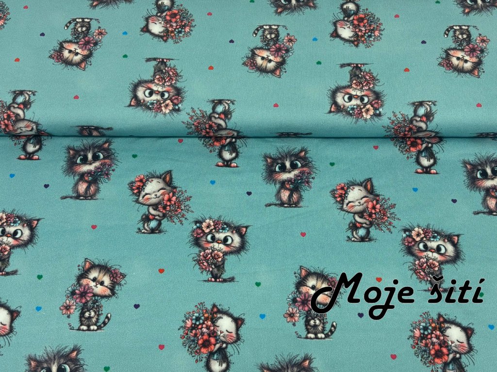 Bavlněný úplet s elastanem - Kočičky s květinami 190g II. JAKOST