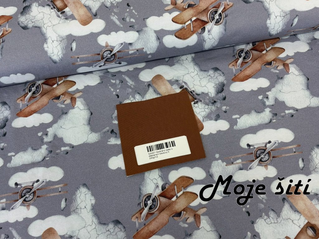 Bavlněný úplet s elastanem - Letadla na mapě 190g