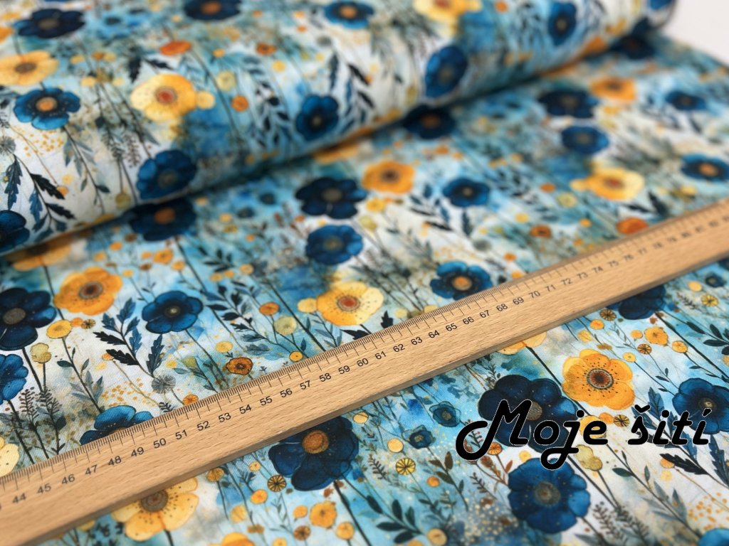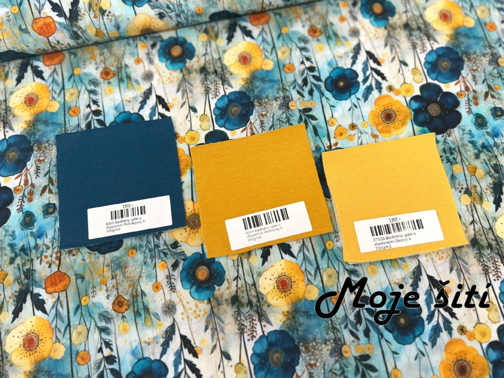 Bavlněný úplet s elastanem - Modro-žluté kvítky 190g