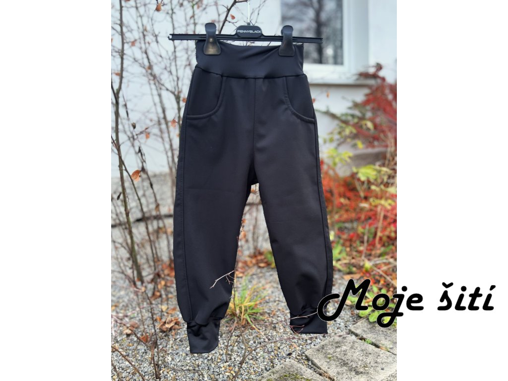 Ušité softshellové kalhoty z dílny Moje šití. Kalhoty mají vyšší funkční náplet v pase, aby chránil záda proti chladu. Náplety na konci nohavic jsou také delší, můžete je zahnout, kalhoty tak mnohem déle dětem vydrží - jsou označovány jako rostoucí. Náplet je z funkčního rychleschnoucího materiálu.