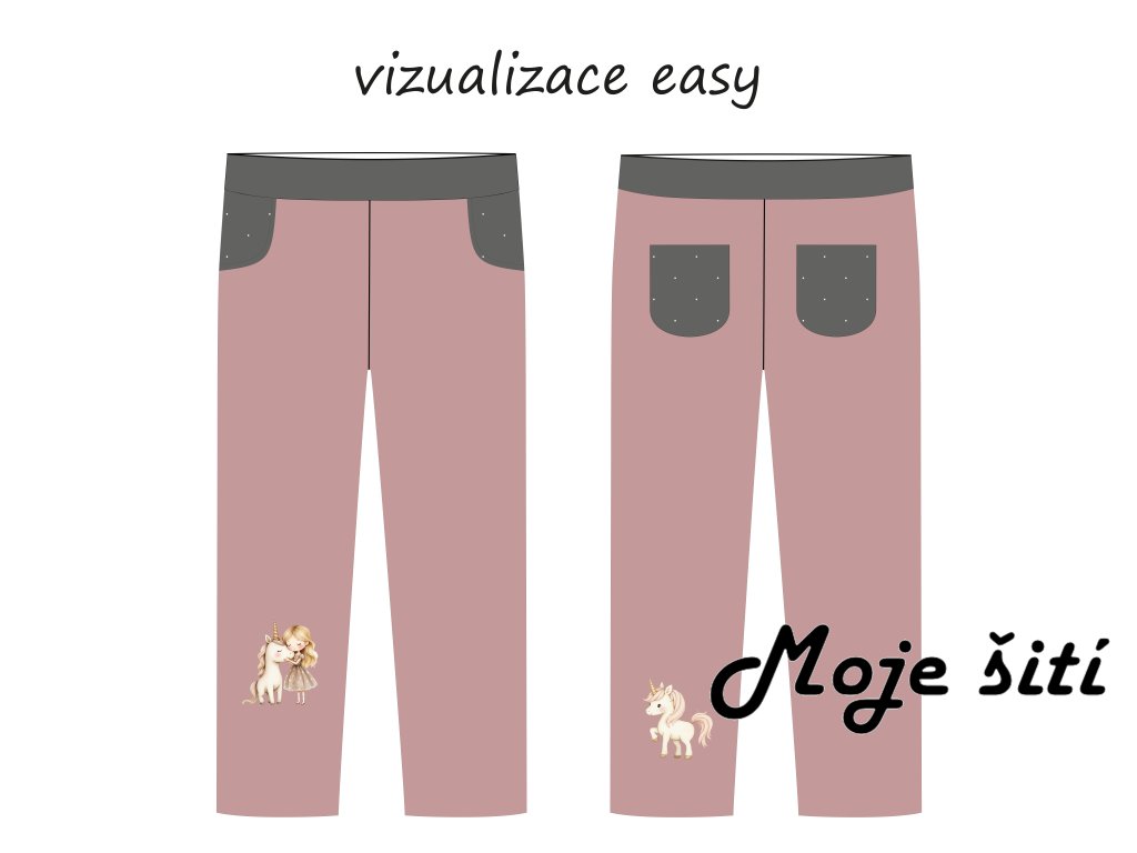 Střih kalhot má prodlouženou délku 2,5 cm od běžné délky kalhot. Takto lze kalhoty zakončit dole do gumy nebo podle značení ustřihnout a zakončit do nápletu.