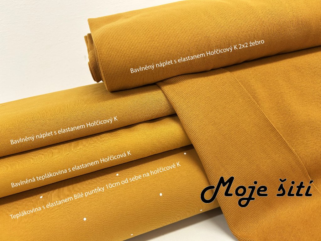 Teplákovina s elastanem Bílé puntíky 10cm od sebe na hořčicové K