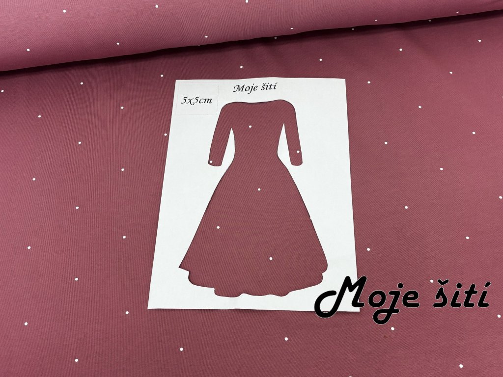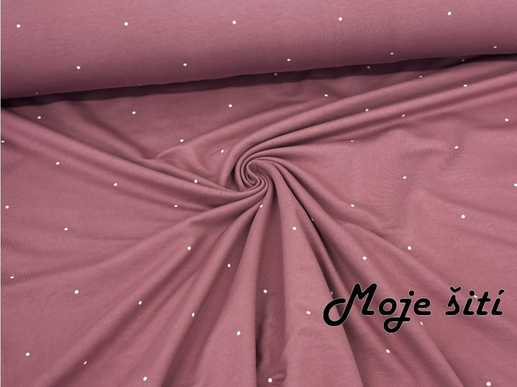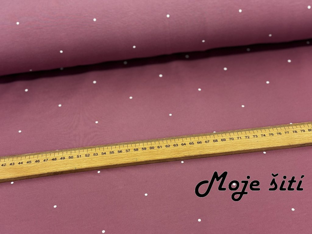 Teplákovina s elastanem Bílé puntíky 10cm od sebe na starorůžové tmavé