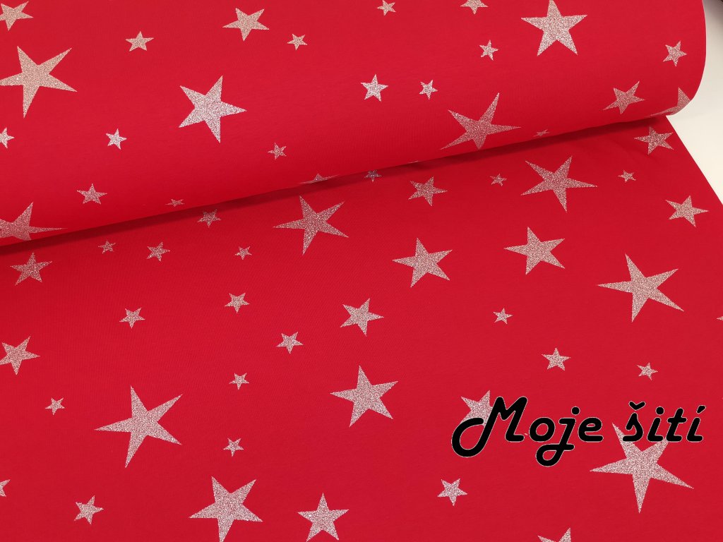 Teplákovina s elastanem Stříbrné vánoční hvězdy na červené K