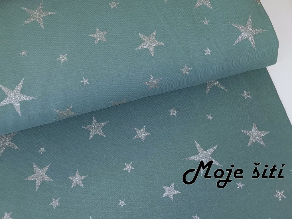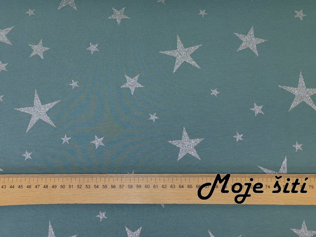 Teplákovina s elastanem Stříbrné vánoční hvězdy na eukalyptu