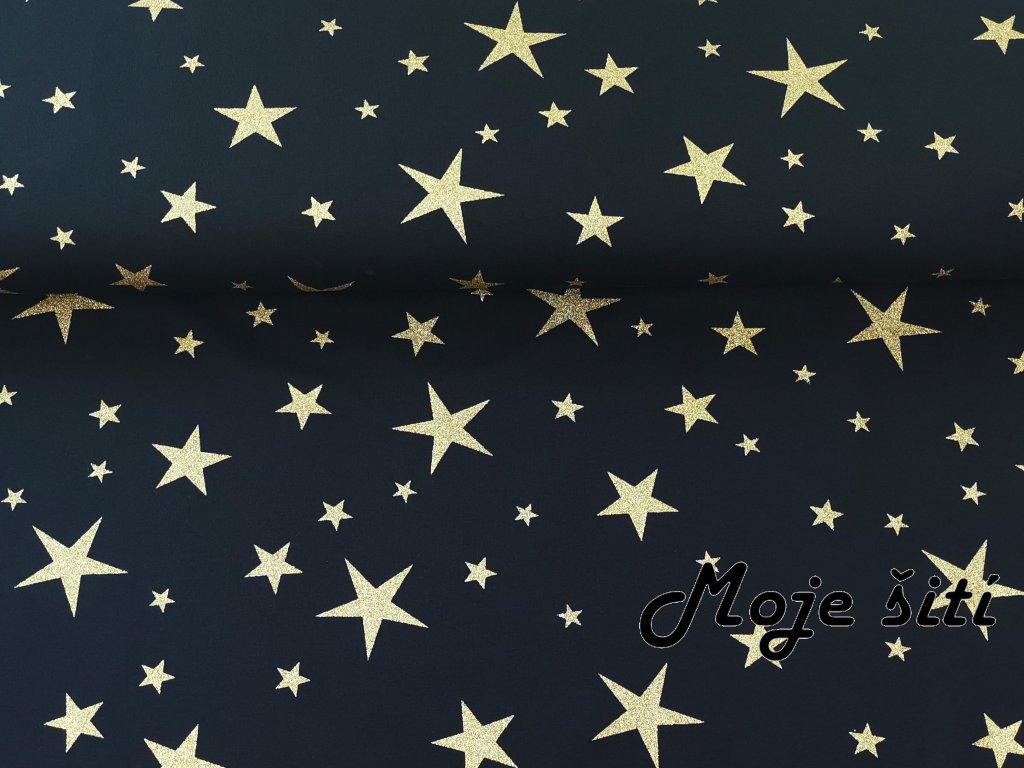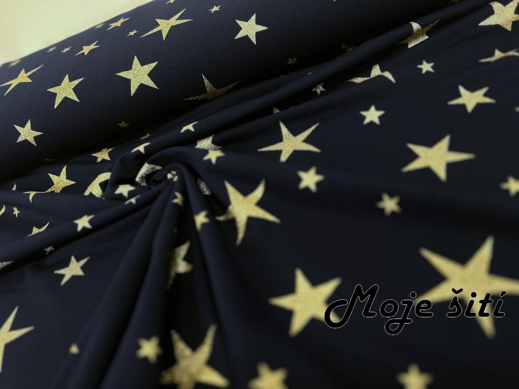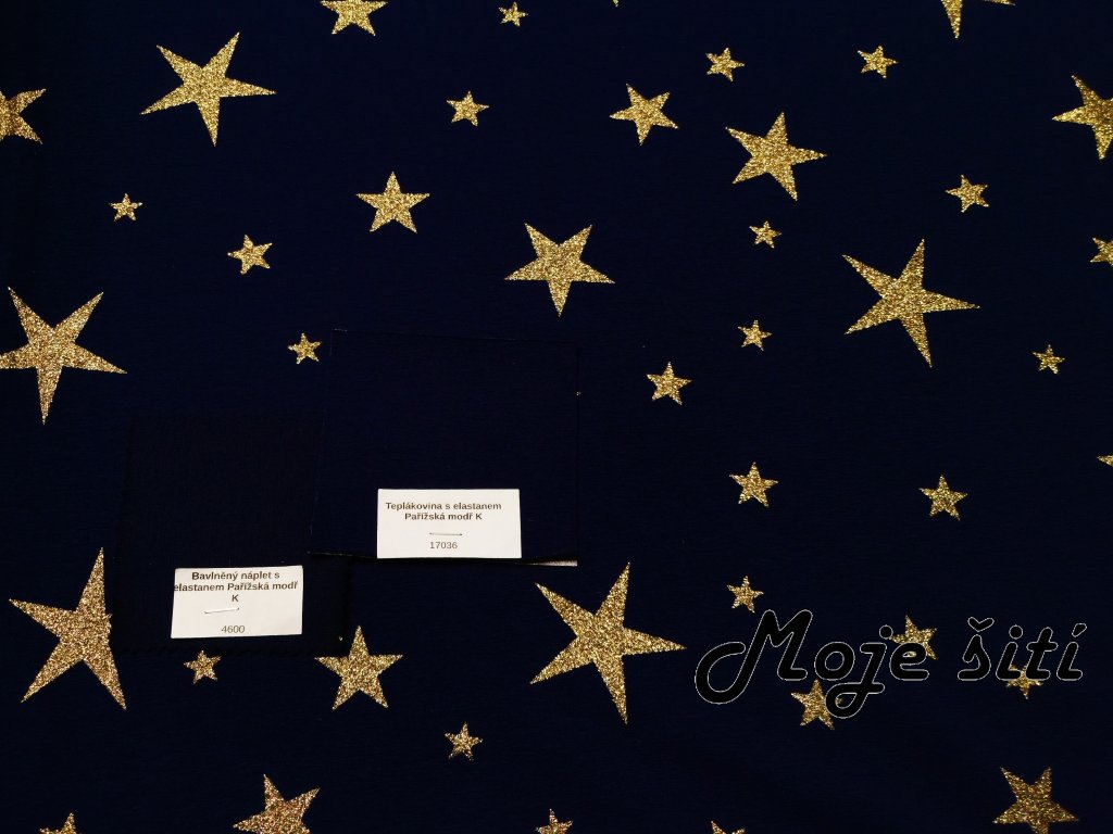 Teplákovina s elastanem Zlaté vánoční hvězdy na pařížské modré
