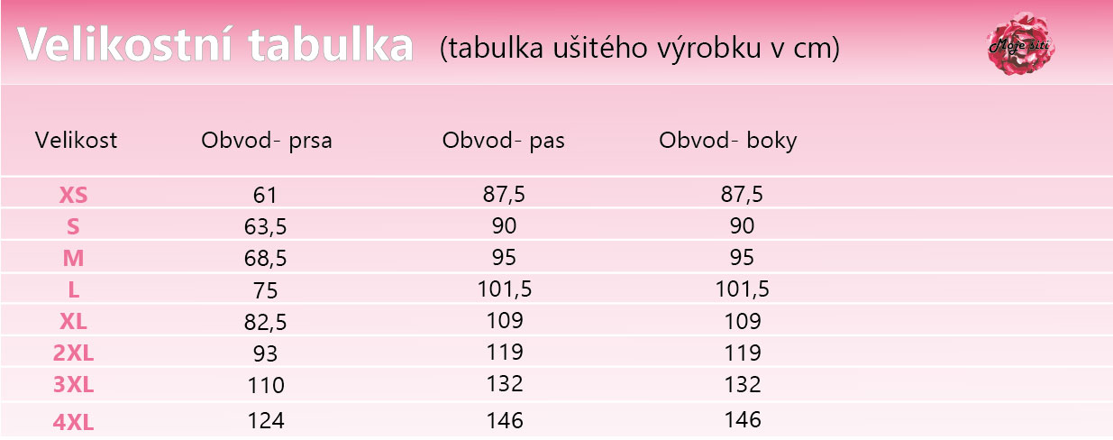 Tabulka velikostí je natištěna přímo ve střihu.