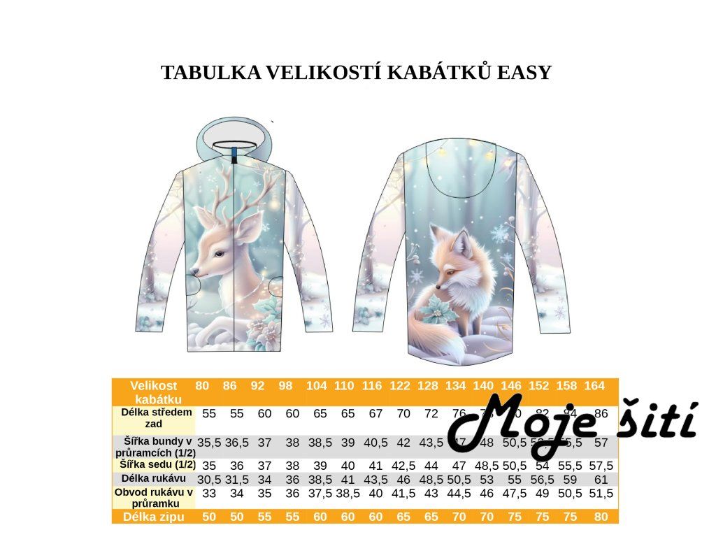 Tabulka velikostí je natištěna přímo ve střihu.