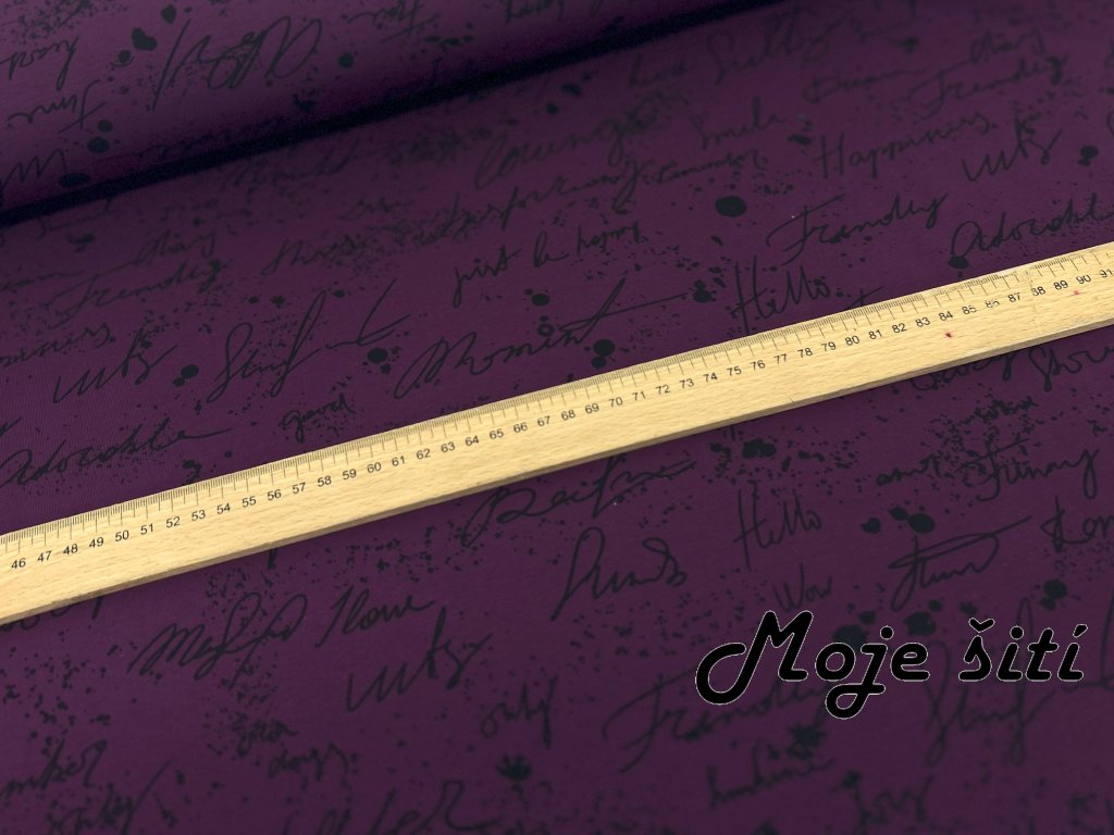 Úplet s elastanem Černé nápisy na tmavé švestce