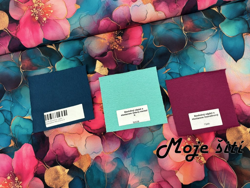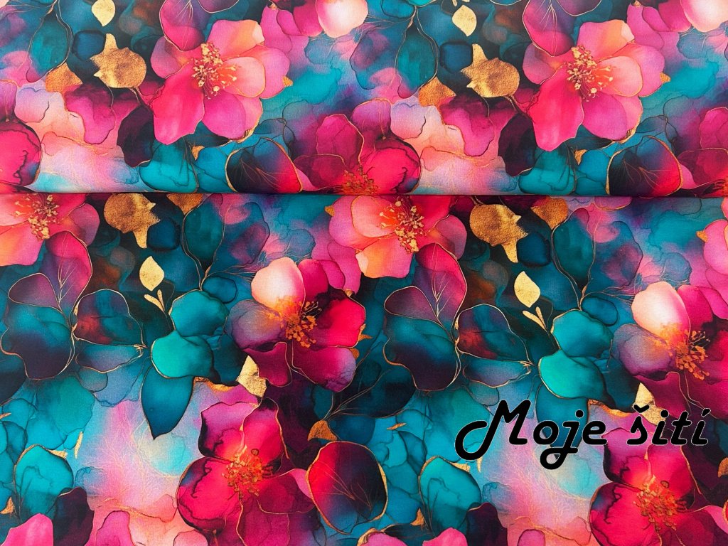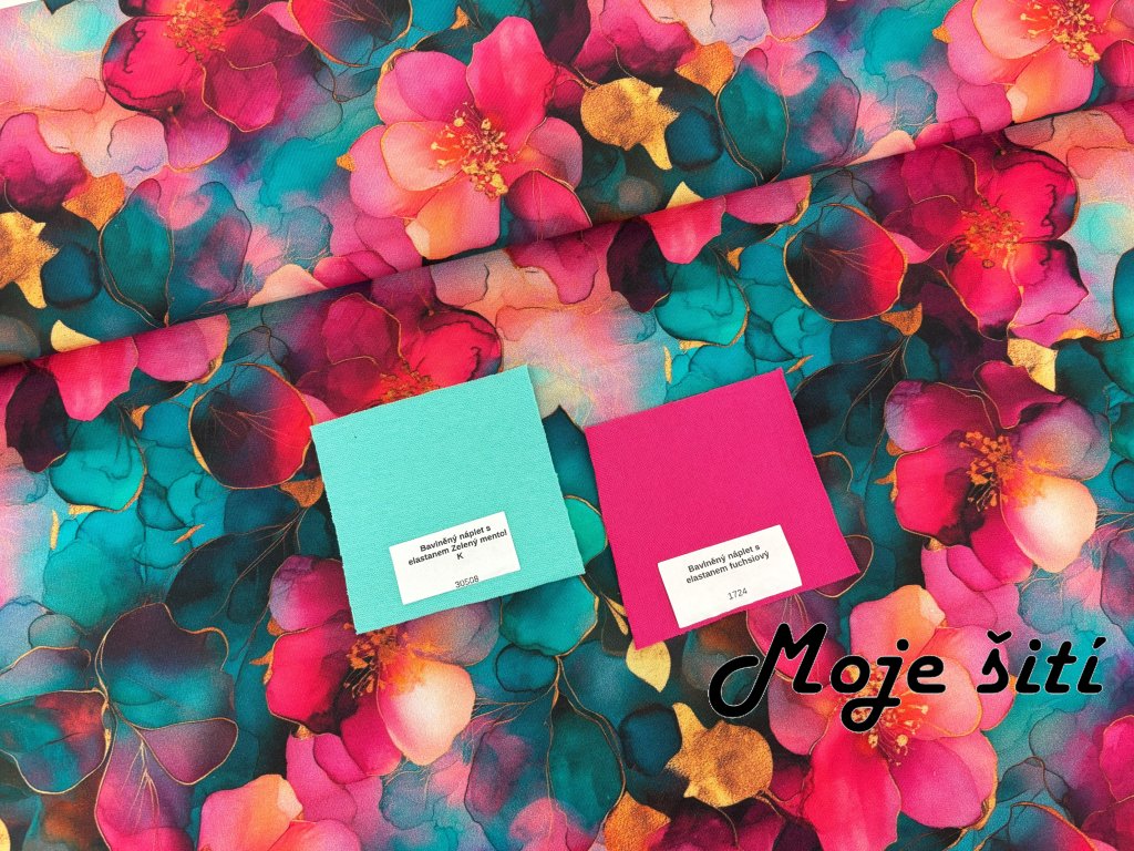 Zimní softshell - Inkoustové smaragdovo-růžové květy